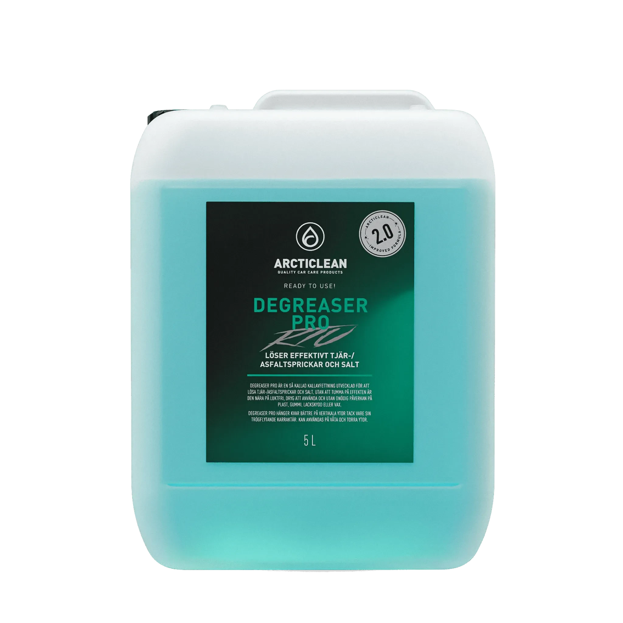 Why cold degreaser? In addition to tar/asphalt cracks (the small black dots that make the paint rough) and salt, Degreaser PRO also dissolves oil. In other words, it dissolves many common types of dirt that a regular alkaline degreaser does not work on. Especially during winter, it is extra important to use a cold degreaser when the roads are salted and the studded tires tear up oil particles from the asphalt. Works great for dissolving difficult grease stains even on textiles and for engine washing.