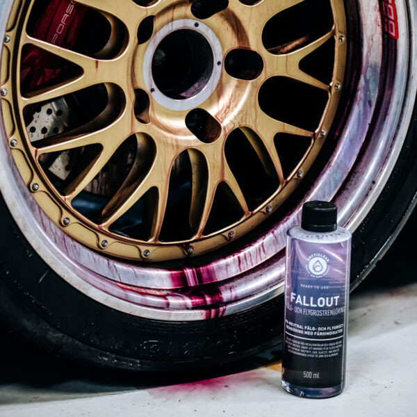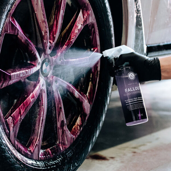 Fallout is a pH-neutral rim and fly rust cleaner with a color indicator. Fallout reacts with metal particles and turns red when it dissolves the dirt. Safe to use on most materials such as aluminum, stainless steel, paint, glass, etc. Also has an oxidation-inhibiting effect on iron and aluminum.