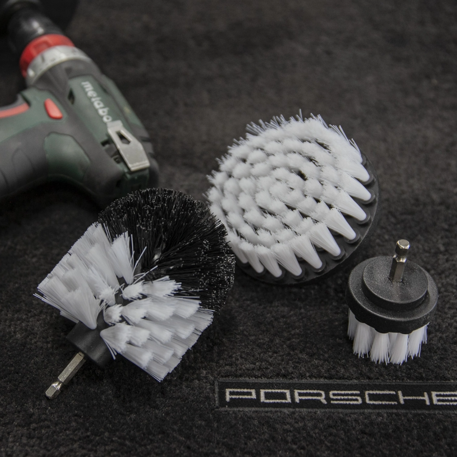 3x cleaning brushes for screwdrivers with "fairly" hard bristles. The toilet brush-shaped one works for us primarily to clean the inside of the exhaust system, some places in the engine compartment and also mugs. The flat brushes are used for both textile and rubber mats, but work well to clean most insensitive surfaces, can be used both dry to whip up sand and gravel, but also together with Interior clean and then vacuumed clean.