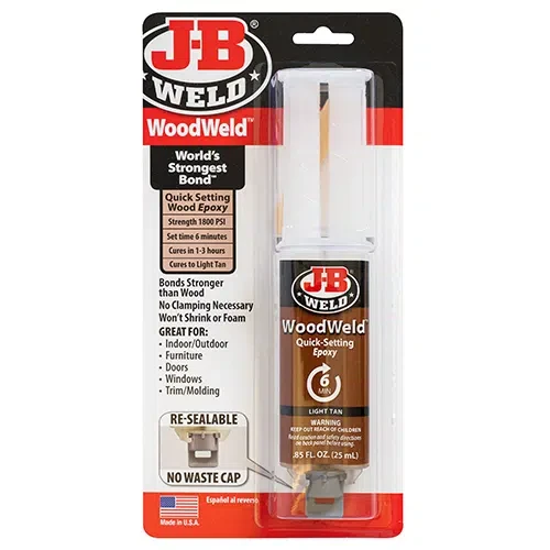 JB WoodWeld is a fast curing two part epoxy that can be used for wood bonding and repairs. It provides a long lasting permanent bond that is stronger than wood! Cures in 1-3 hours then can be shaped, tapped, sanded and drilled. JB WoodWeld has a 1:1 mix ratio and a tensile strength of 1800 PSI, Cures to a light brown color.