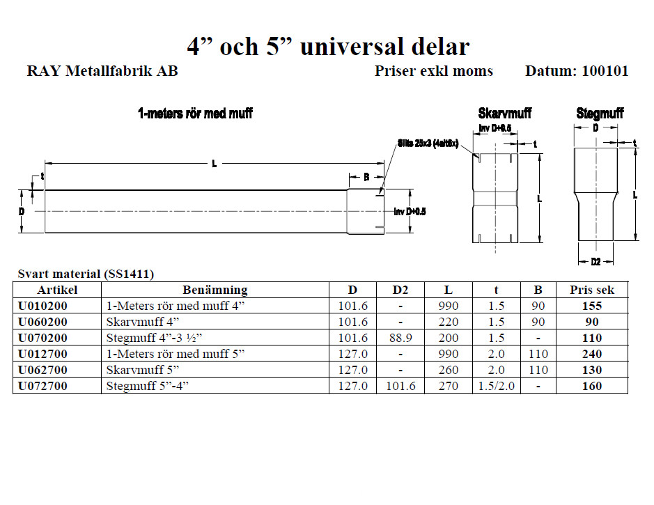 4 inch 1-meter pipe in Black Steel. Simons Black steel straight pieces and step sleeves 4 " U010200 1-Meter pipe with sleeve 4" 385 kr