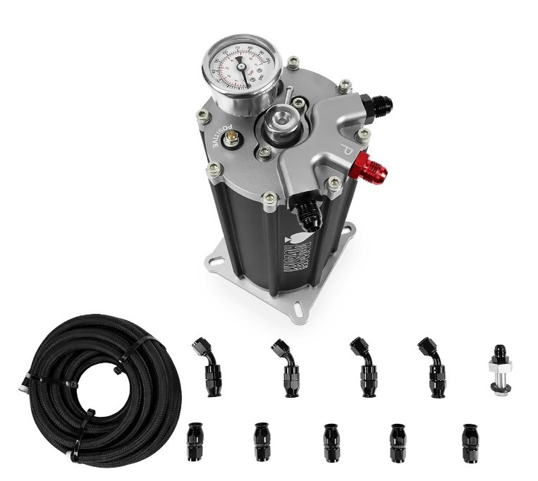 Optimera bränsletillförseln med denna catch tank med inbyggd elektrisk högtrycks 340 lit./tim. bränslepump och 0-100 psi / 0-7 bar bränsletrycksmätare.