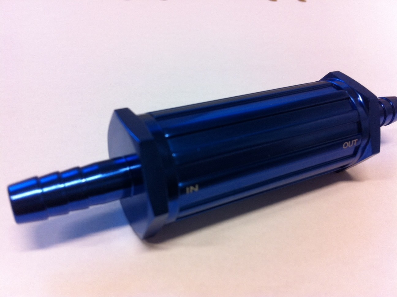 The filter has grooved nipples at each end for hose with hose clamp.