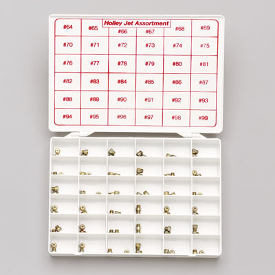 These Holley gasoline jet assortment kits are the professional way to track-tune your Holley carburetor for top performance. They consist of two each of 36 different jet sizes, ranging from size #64 to #99. The jets are contained in a plastic case that is designed to keep them separated and make them easily accessible.