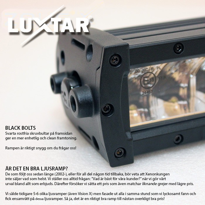 Luxtar® X50 Black Edition has a light intensity of 20,937 lumens and is 135 cm, which provides an incredible light image and can be compared to almost 21 halogens at 55w | 1,000 Lumen (+-200 lm).
