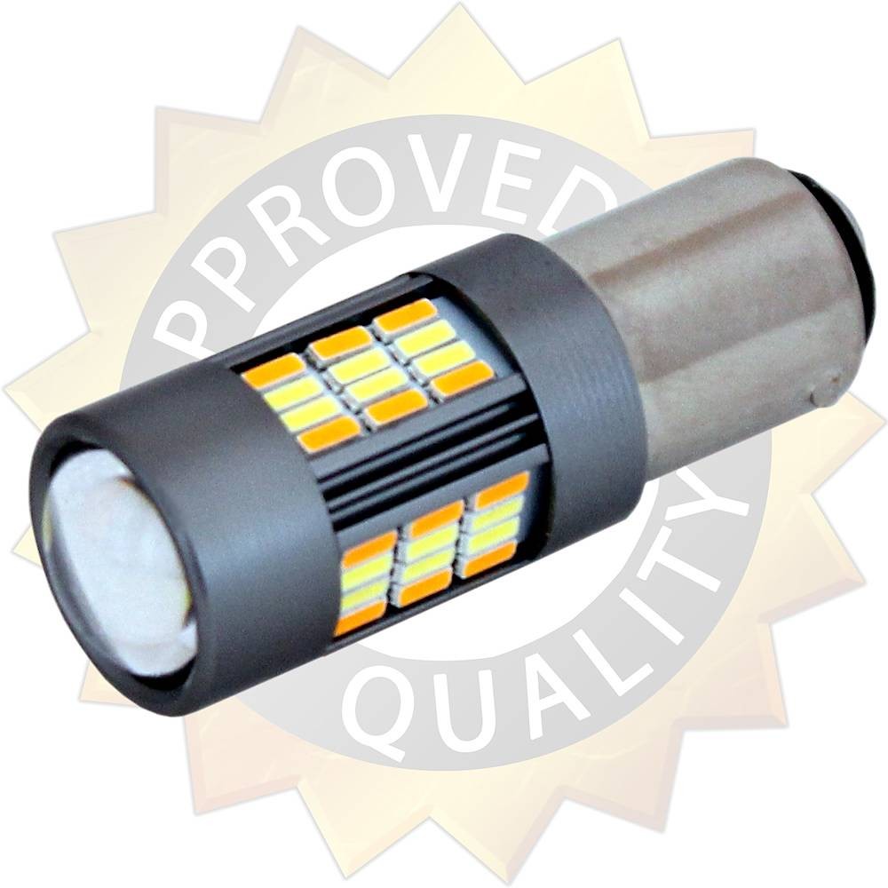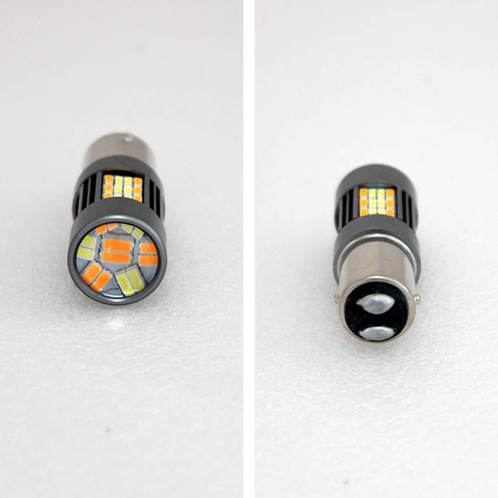 BAY15D 2-pin diode lamp that changes light color between White (Position light) and Yellow/Amber (Turn signals) depending on the selected function in vehicles with a common lamp for position light and turn signal.