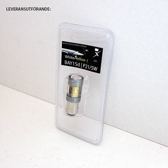 BAY15D 2-pin diode lamp that changes light color between White (Position light) and Yellow/Amber (Turn signal) depending on the selected function in vehicles with a common lamp for position light and turn signal. Can replace bulb P21/5W, 1157. Voltage: 12V