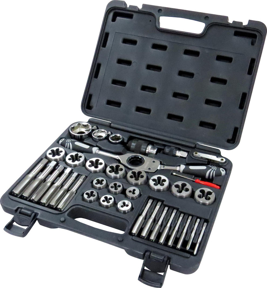 Gängverktygsats, 36 delar. Gängverktyg för att göra in-och utvändiga gängor från M6 – M18. Gängkloppor av unik ny modell med spärrhandtagsfunktion. Gör jobbet betydligt smidigare. Innehåll: Gängkloppa, gängtappshållare, gängsnittshållare, mejsel, gängtolk samt gängtappar och gängsnitt. Innehåll: 14 st tappar :(Metric) M6 x 0.75, M6 x 1.0, M8×1.0, M8 x1.25, M10x1.25, M10 x 1.5, M12 x 1.5, M12 x 1.75, M14 x 1.5, M14 x 2.0, M16 x 1.5, M16 x 2.0, M18 x 1.5, M18 x 2.5 6 st 25 mm OD gängbackar :(Metric) M6 x 0.75, M6 x 1.0, M8×1.0, M8 x1.25, M10x1.25, M10 x 1.5 8 st. 38 mm OD Gängbackar :(Metric) M12 x 1.5, M12 x 1.75, M14 x 1.5, M14 x 2.0, M16 x 1.5, M16 x 2.0, M18 x 1.5, M18 x 2.5 1 Gängkloppa med spärrfunktion (25mm) 1 Adaptor 2 Tapphållare (M6-M12 )、(M12-M18 ) 2 Hållare för gängback (25 mm), (38 mm) 1 Gängtolk 1 Skruvmejsel